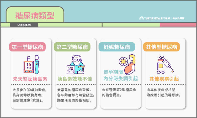 - 第1型糖尿病:又稱「胰島素依賴型糖尿病」,因免疫系統異常,會攻擊胰臟產生胰島素的細胞,導致胰島素無法分泌。大多會在30歲前發病,發病後需終身依賴注射胰島素。
