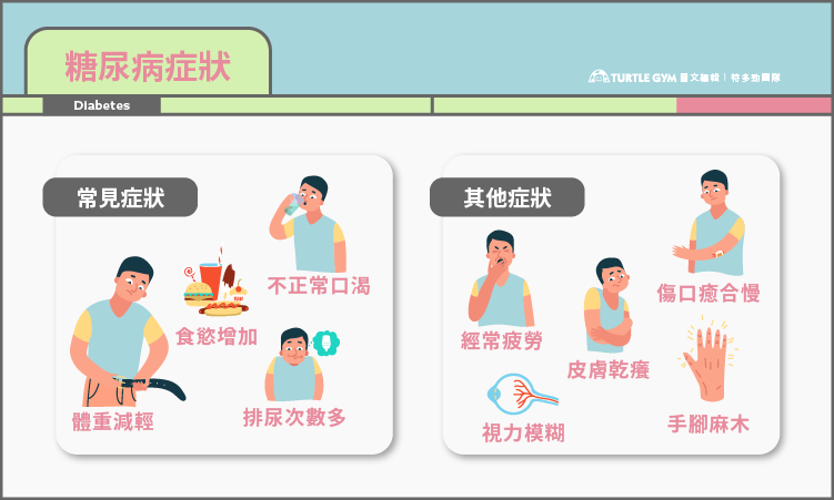 糖尿病初期不易被發現,多數人沒有明顯的症狀,通常要等到患者出現多吃、多喝、多尿或體重減少時,去醫院檢查才發現已經罹患糖尿病。