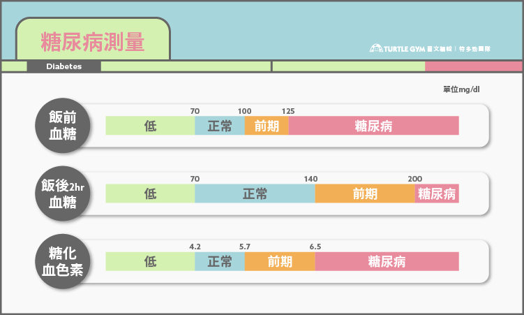 - 飯前(空腹)血糖:正常血糖值應<100mg / dL ,若數值在100-125 mg / dL屬於糖尿病前期,超過126 mg / dL確診為糖尿病。