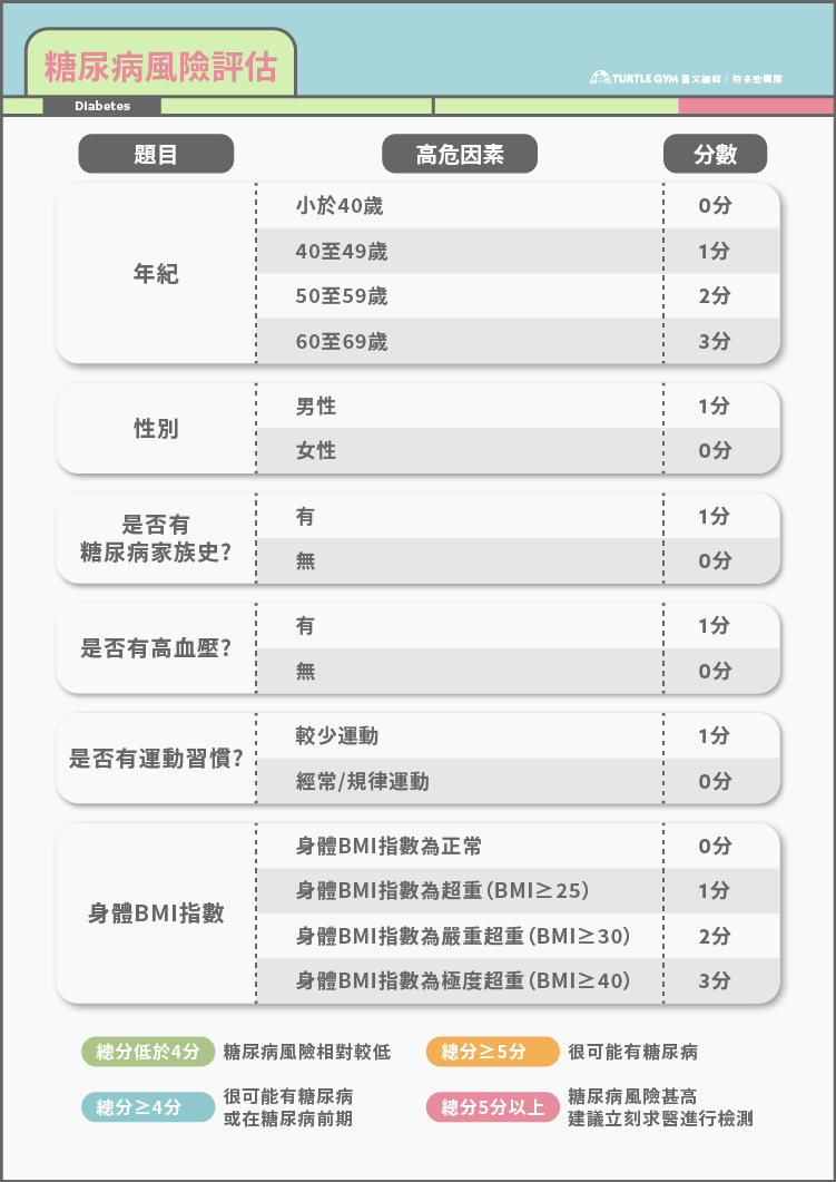 美國《Ann Intern Med》提出的「糖尿病風險評估表」,也可以初步評估是否有高血糖危機,提醒糖尿病高危險族群注意並接受檢查:
