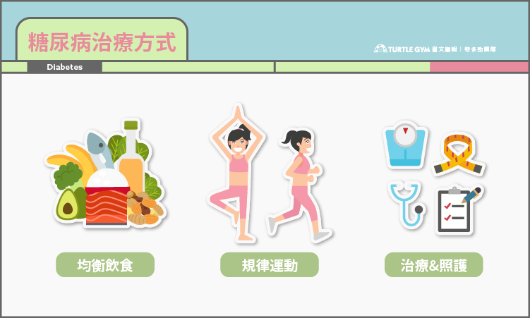 糖尿病雖然無法根治,但可以透過均衡飲食、規律運動及藥物治療三者間的相互配合來控制,糖尿病治療的目標在於維持血糖在正常範圍,減少併發症發生的機會。