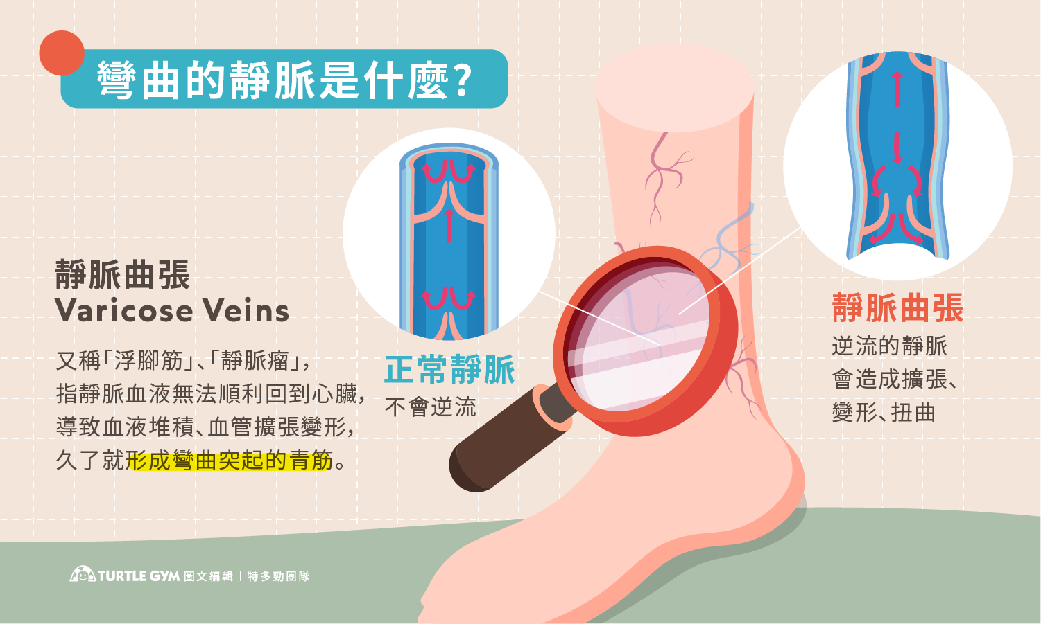 靜脈曲張(Varicose Veins),俗稱為「浮腳筋」、「靜脈瘤」,是靜脈血液無法順利回到心臟,導致血液堆積、血管被擴張變形,久了就形成彎曲突起的青筋,常發生在小腿,特別是久站久坐的人。