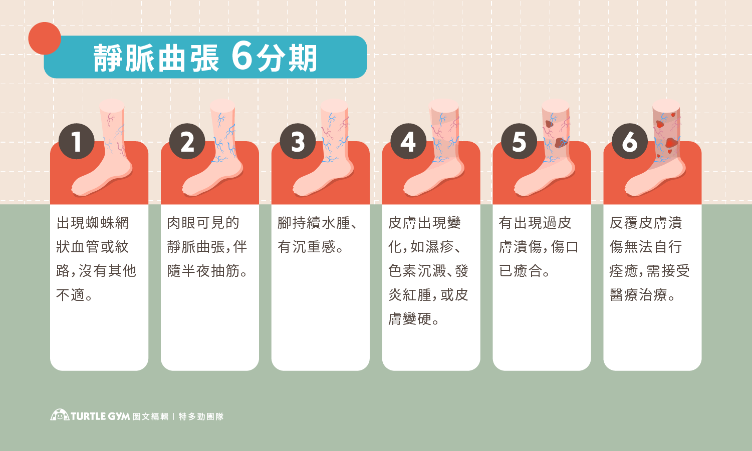 在醫學上常使用CEAP分類,依嚴重程度分級成6期: