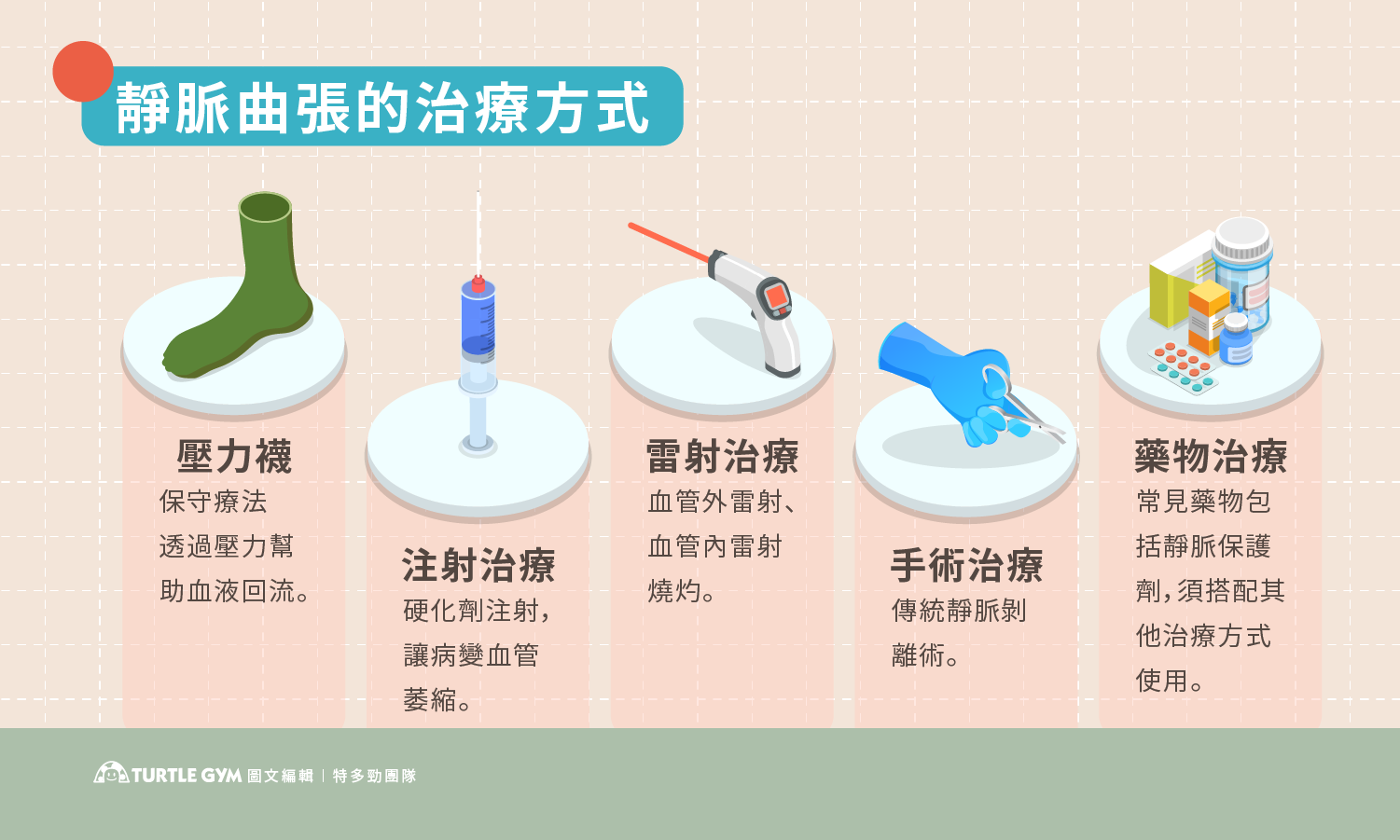 靜脈曲張的治療主要是以改善血液回流、減輕症狀與避免惡化為目的,有個重要觀念是要先處理大靜脈問題,如果先處理表面可見的小靜脈,短期內會以為康復了,但一段時間後容易復發。