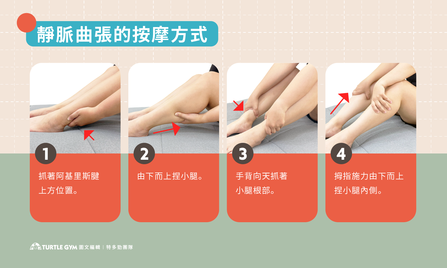 - 每次按摩時間約20-30分鐘,避免過於用力揉壓凸起的青筋,以免血管破裂或瘀青。